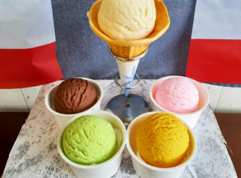 瀬波南国フルーツ園のジェラート各種 クランベリーヨーグルト、シークワーサー、マンゴー、チョコレート、村上茶、笹川流れ塩ミルク
